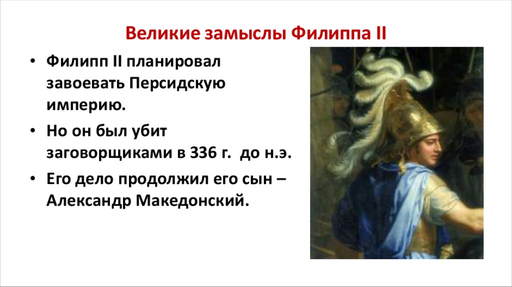 • Филипп II — царь Македонии, отец Александра Македонского.