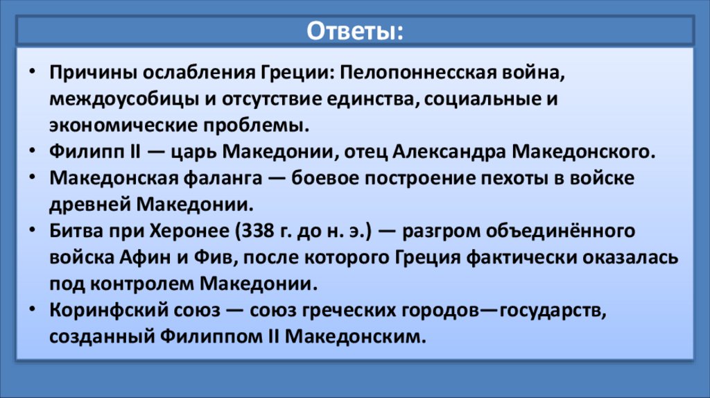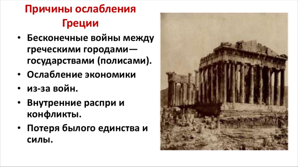 Ответы:• Причины ослабления Греции: Пелопоннесская война,