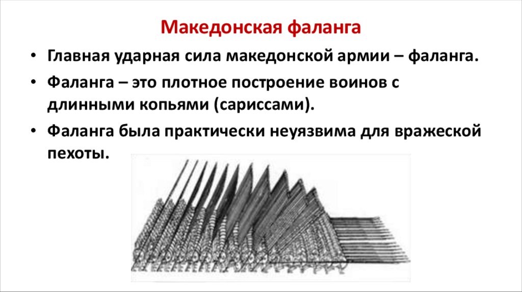 Македонская фаланга• Главная ударная сила македонской армии – фаланга.