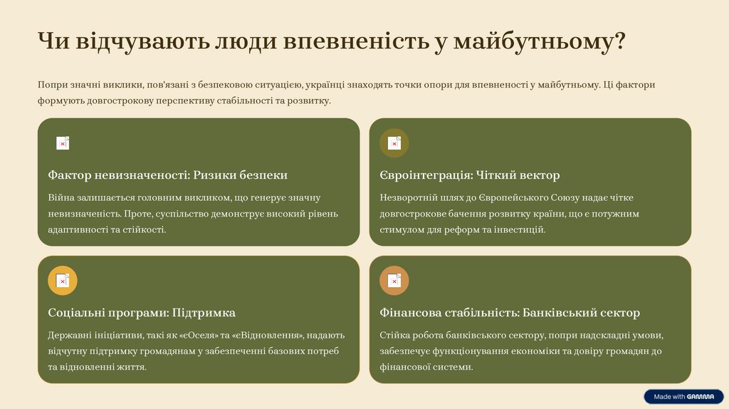 Чи відчувають люди впевненість у майбутньому?Попри значні виклики, пов'язані з безпековою ситуацією, українці знаходять точки опори для впевненості у майбутньому. Ці фактори