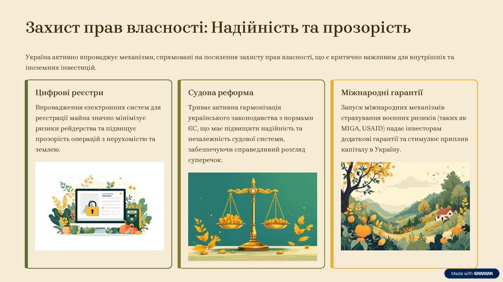 Захист прав власності: Надійність та прозорістьУкраїна активно впроваджує механізми, спрямовані на посилення захисту прав власності, що є критично важливим для внутрішніх та