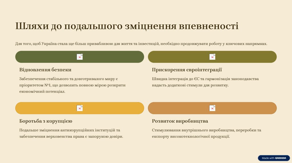 Шляхи до подальшого зміцнення впевненостіДля того, щоб Україна стала ще більш привабливою для життя та інвестицій, необхідно продовжувати роботу у ключових напрямках.