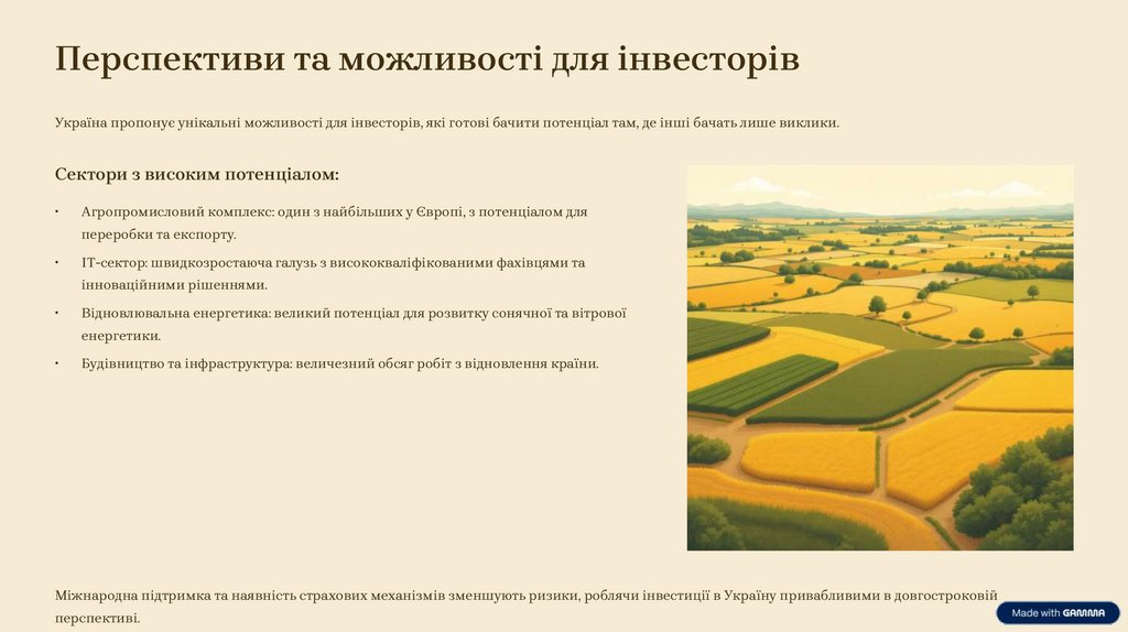 Перспективи та можливості для інвесторівУкраїна пропонує унікальні можливості для інвесторів, які готові бачити потенціал там, де інші бачать лише виклики.