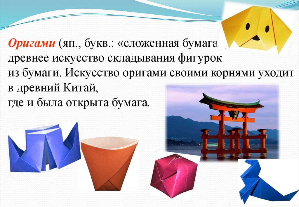 Оригами (яп., букв.: «сложенная бумага») —древнее искусство складывания фигурок