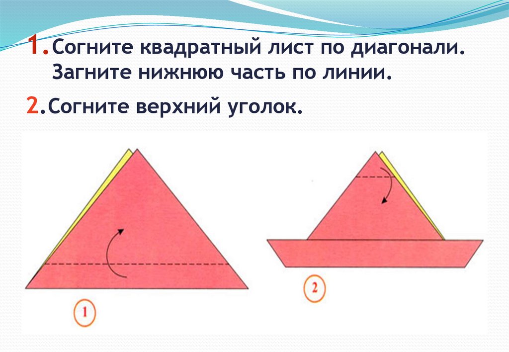 1.Согните квадратный лист по диагонали.Загните нижнюю часть по линии.