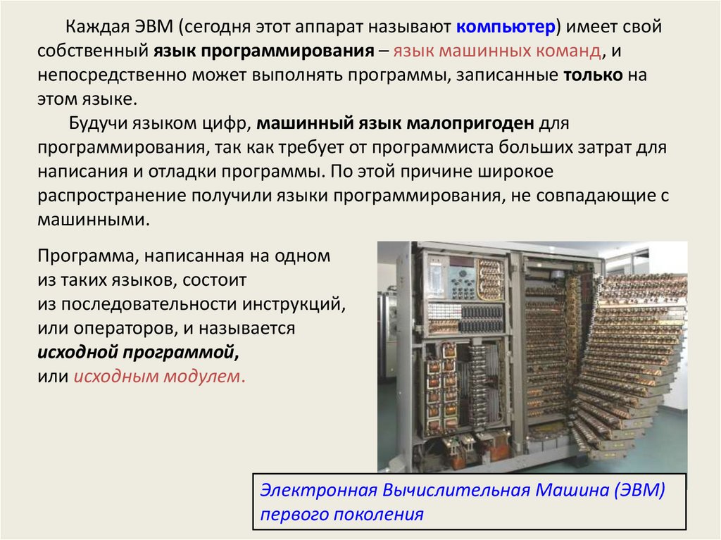 Каждая ЭВМ (сегодня этот аппарат называют компьютер) имеет свойсобственный язык программирования – язык машинных команд, и
