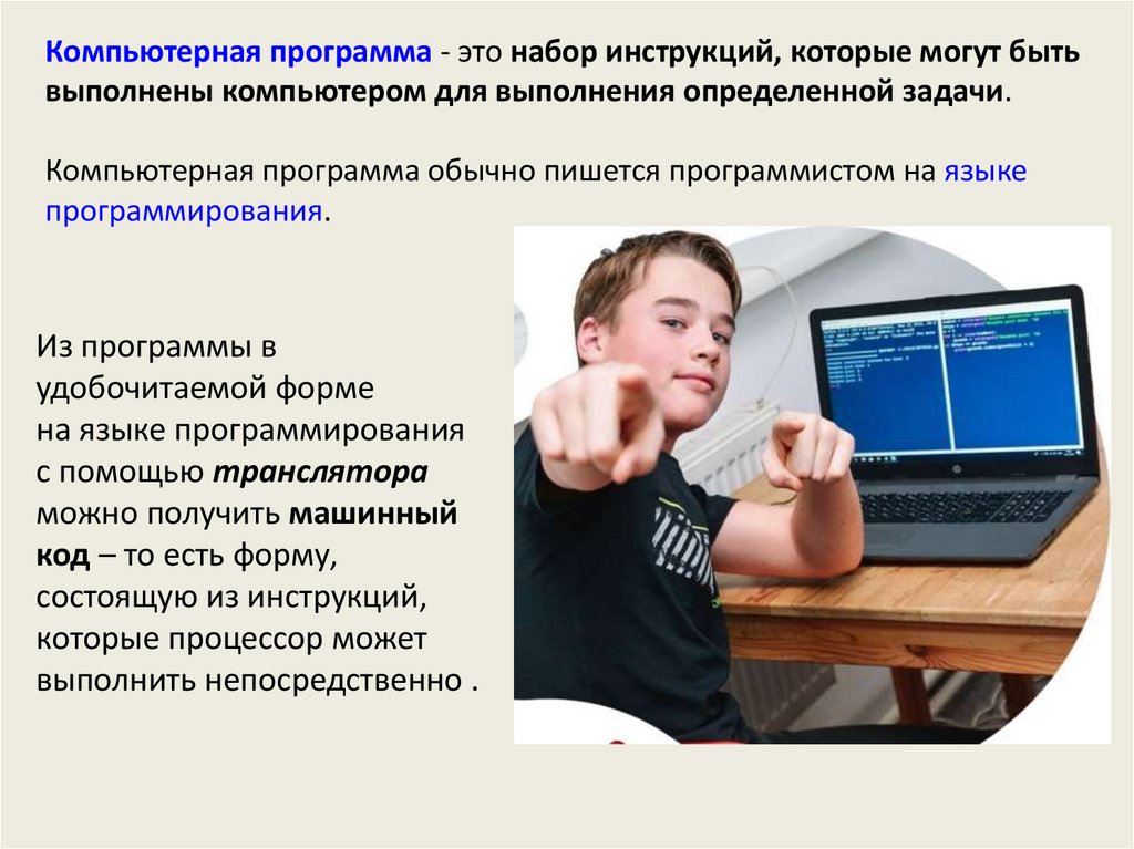 Компьютерная программа - это набор инструкций, которые могут бытьвыполнены компьютером для выполнения определенной задачи.