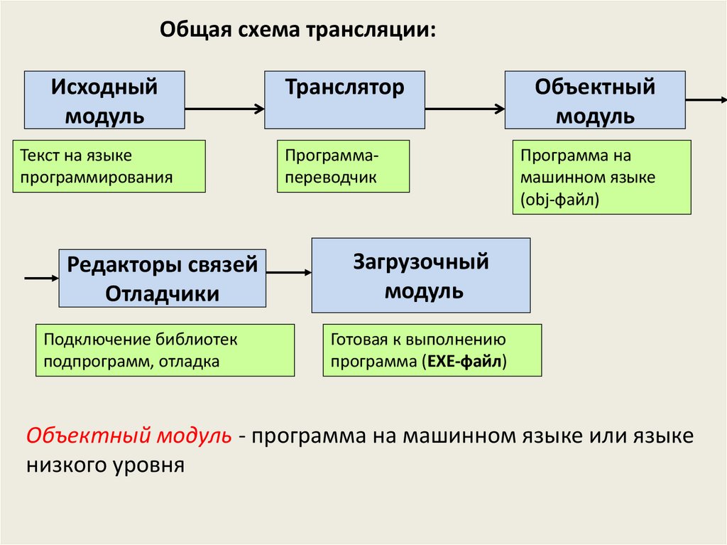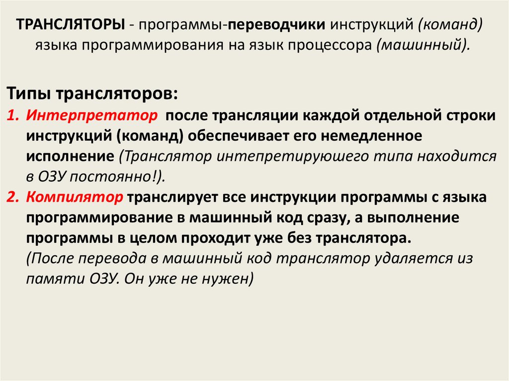 ТРАНСЛЯТОРЫ - программы-переводчики инструкций (команд)языка программирования на язык процессора (машинный).