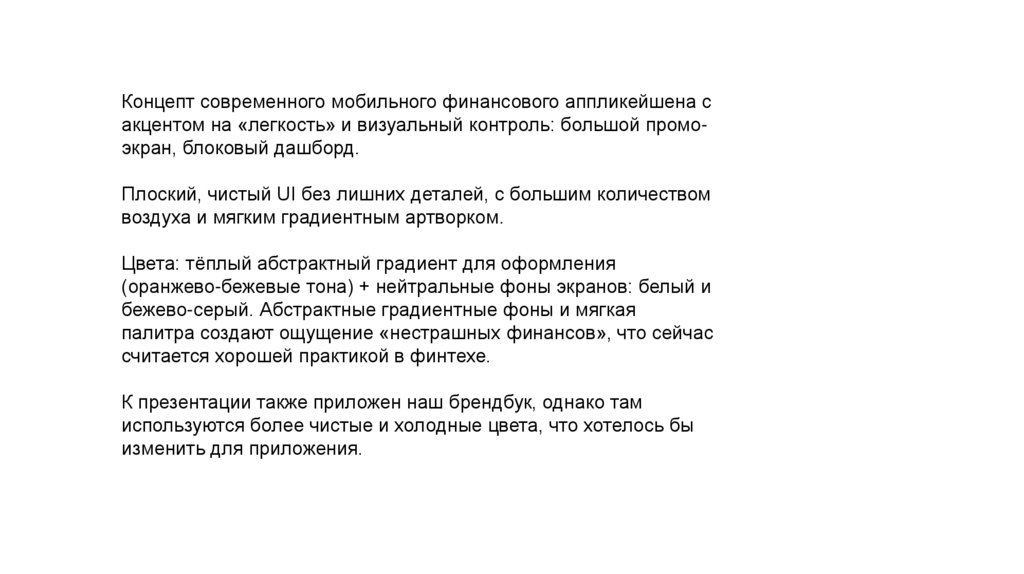 Концепт современного мобильного финансового аппликейшена сакцентом на «легкость» и визуальный контроль: большой промоэкран, блоковый дашборд.