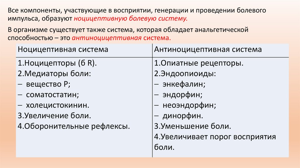 Все компоненты, участвующие в восприятии, генерации и проведении болевогоимпульса, образуют ноцицептивную болевую систему.