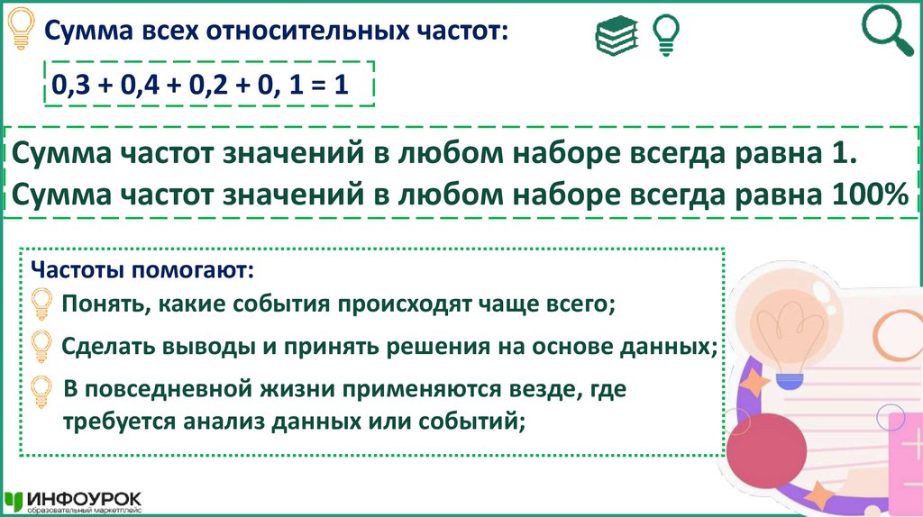 Сумма всех относительных частот:0,3 + 0,4 + 0,2 + 0, 1 = 1