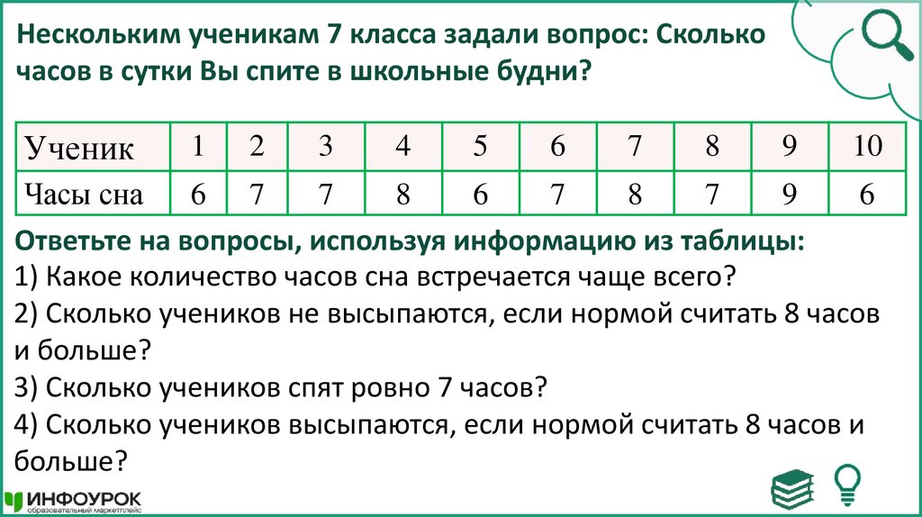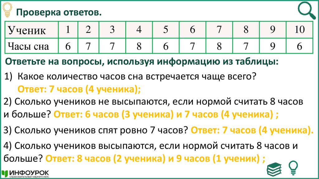 3) Сколько учеников спят ровно 7 часов? Ответ: 7 часов (4 ученика).