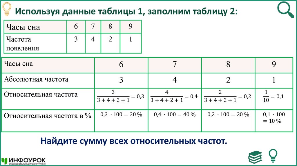Используя данные таблицы 1, заполним таблицу 2:Часы сна