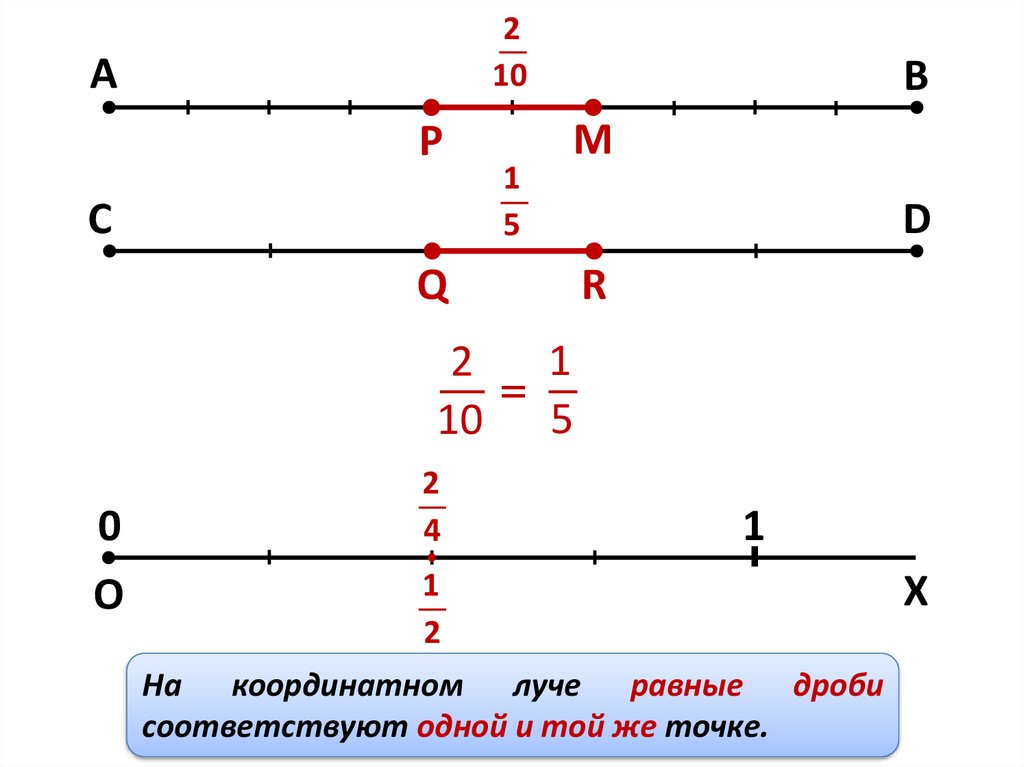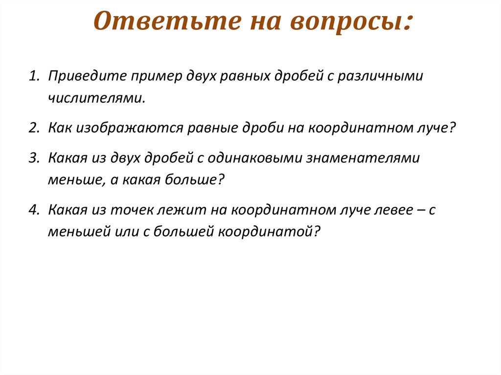 Ответьте на вопросы:1. Приведите пример двух равных дробей с различными
