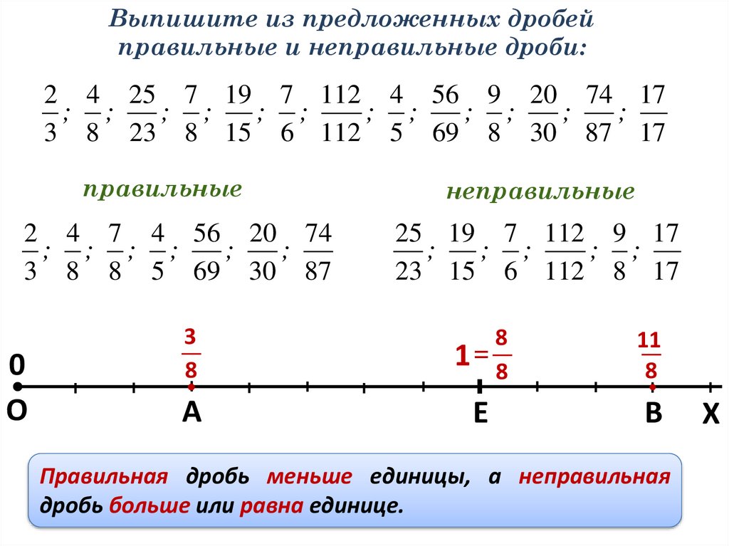 Выпишите из предложенных дробейправильные и неправильные дроби: