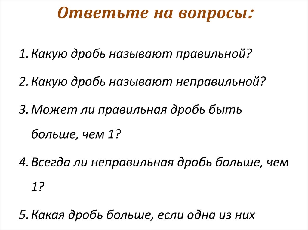 Ответьте на вопросы:1. Какую дробь называют правильной?