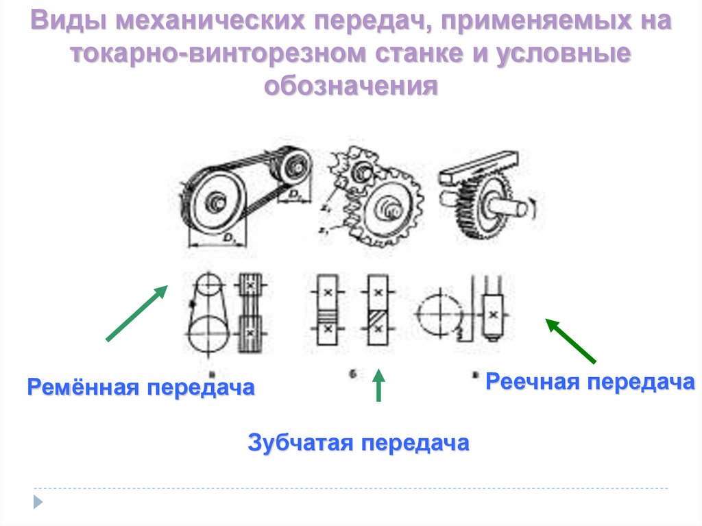Виды механических передач, применяемых натокарно-винторезном станке и условные