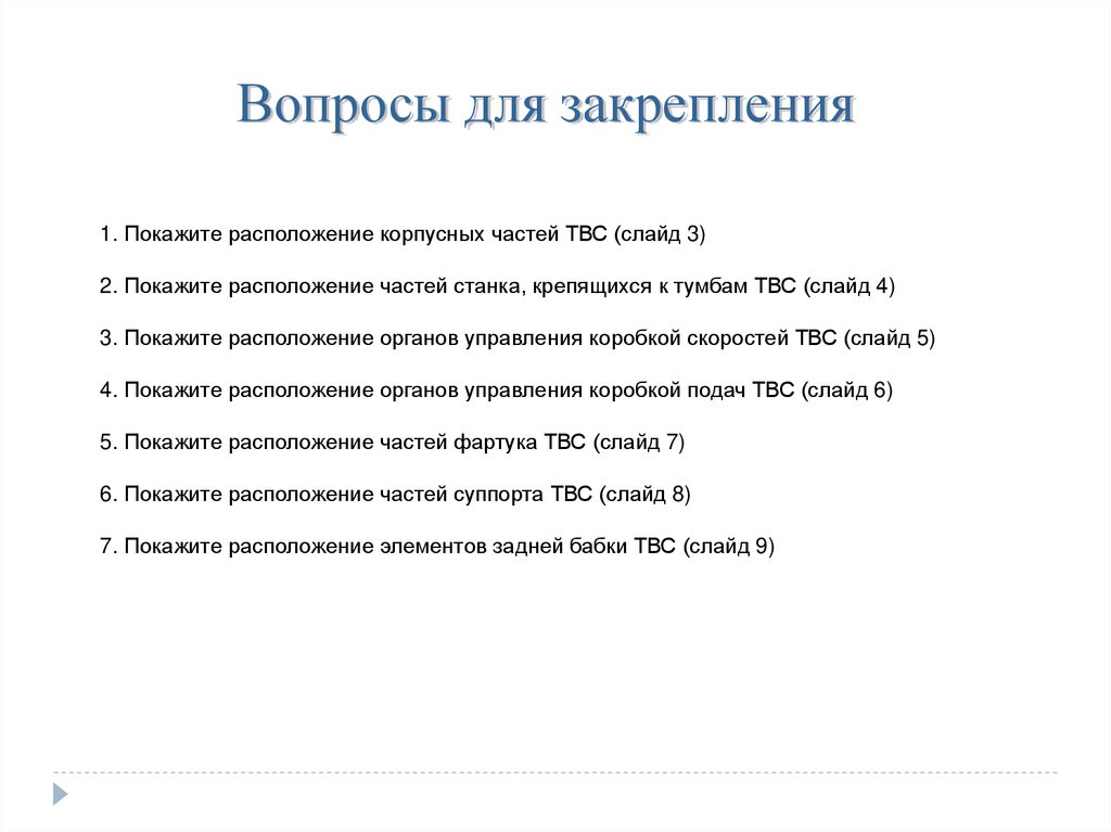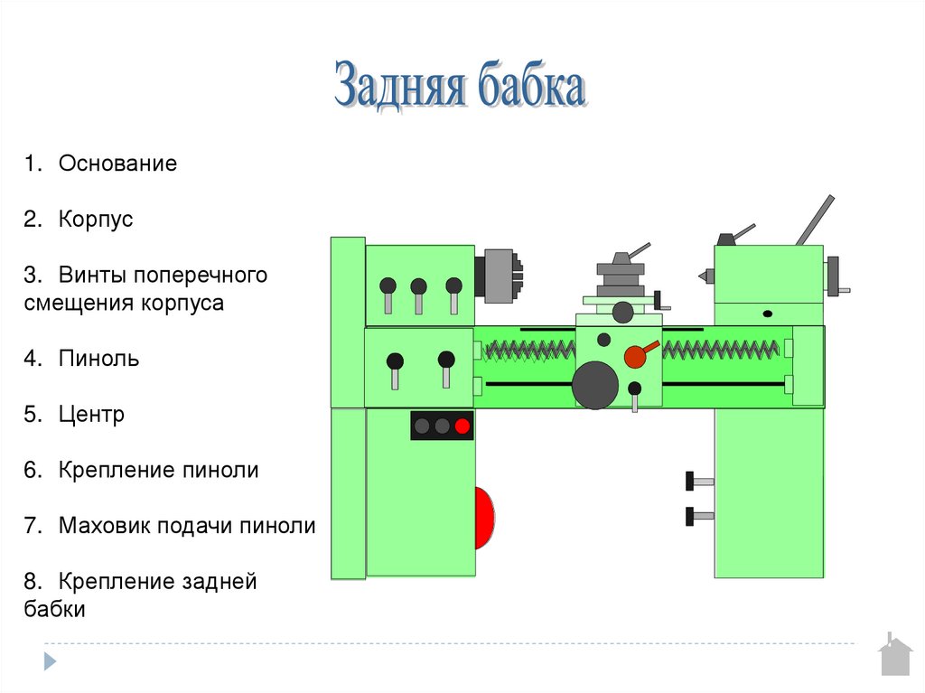 7. Покажите расположение элементов задней бабки ТВС (слайд 9)