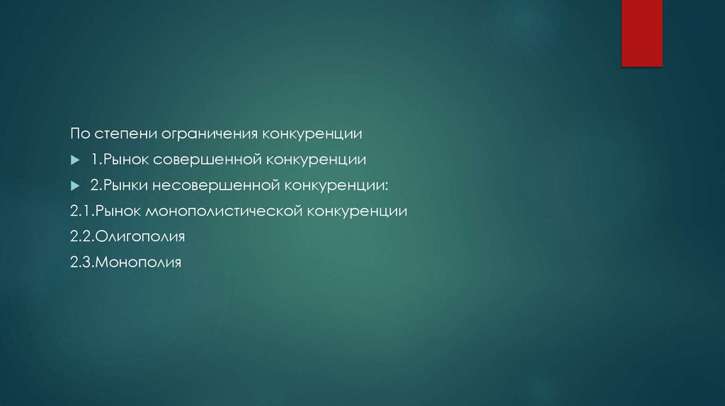 По степени ограничения конкуренции1.Рынок совершенной конкуренции