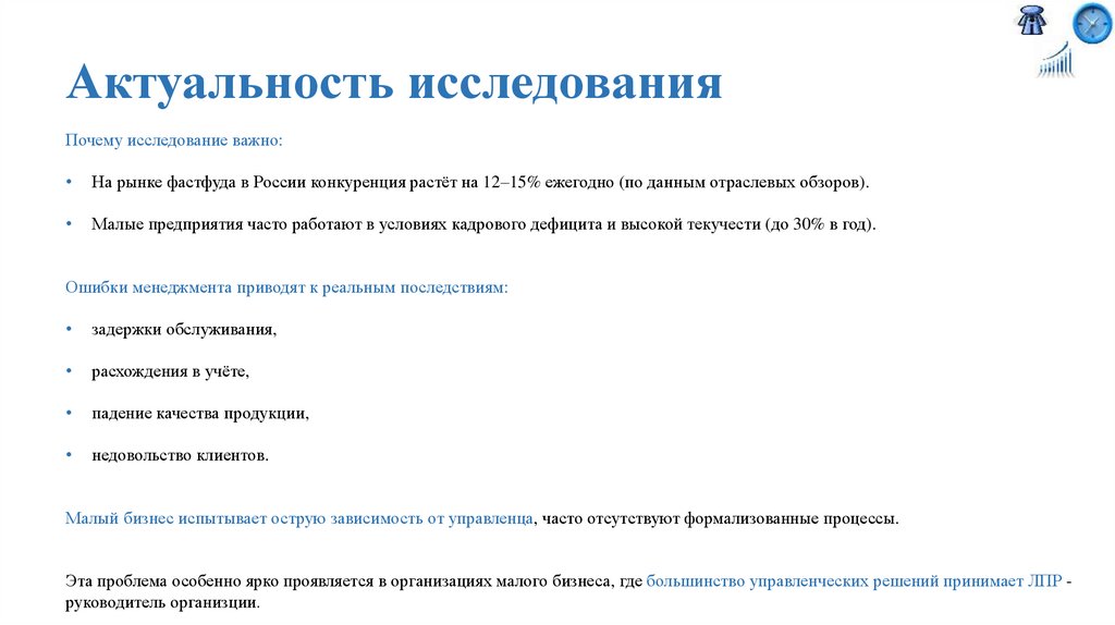 Малый бизнес испытывает острую зависимость от управленца, часто отсутствуют формализованные процессы.