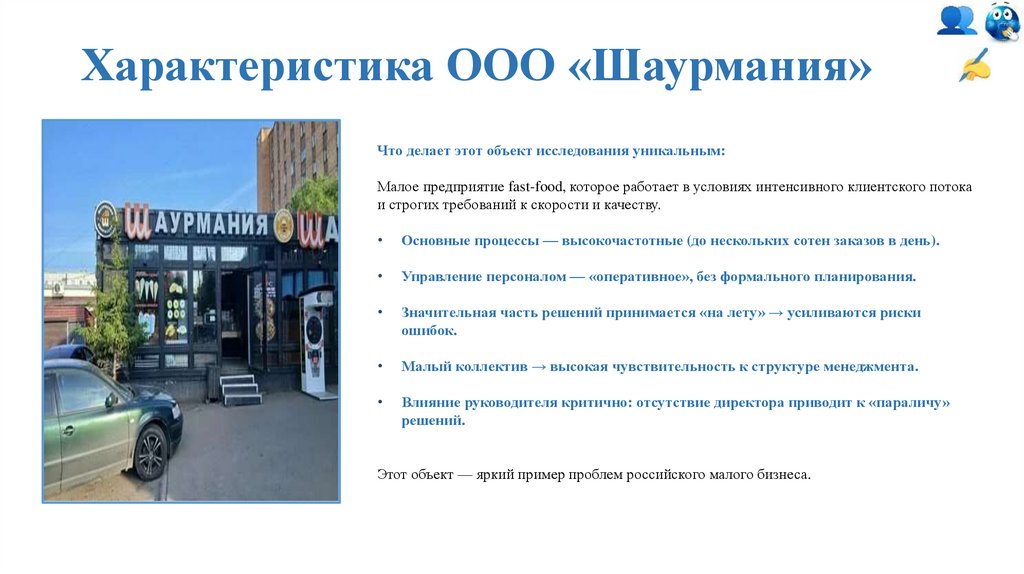 Характеристика ООО «Шаурмания»Что делает этот объект исследования уникальным: