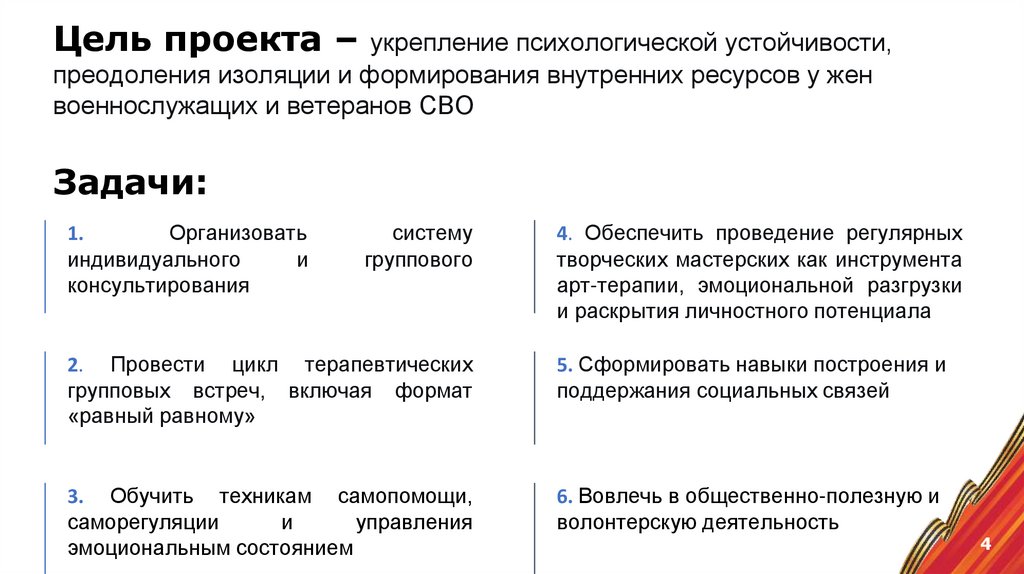 Цель проекта – укрепление психологической устойчивости,преодоления изоляции и формирования внутренних ресурсов у жен