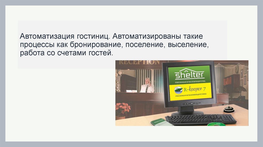 Автоматизация гостиниц. Автоматизированы такиепроцессы как бронирование, поселение, выселение,