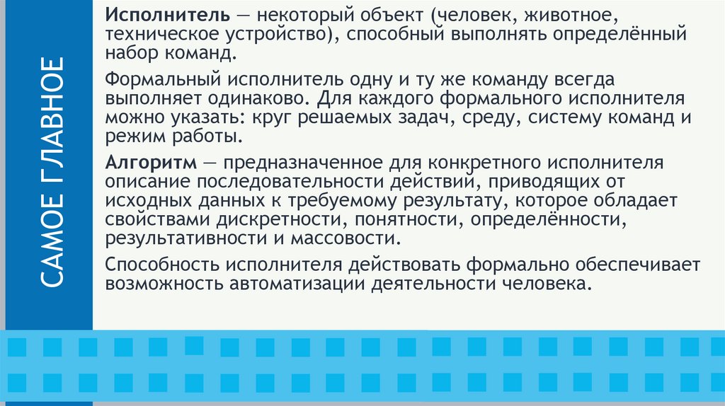 САМОЕ ГЛАВНОЕИсполнитель — некоторый объект (человек, животное,