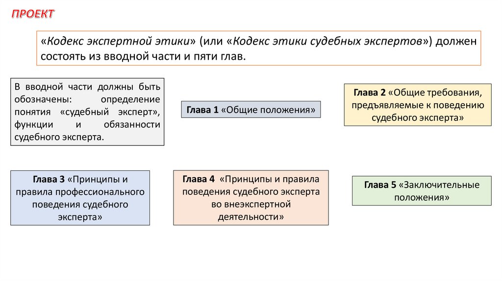 «Кодекс экспертной этики» (или «Кодекс этики судебных экспертов») долженсостоять из вводной части и пяти глав.