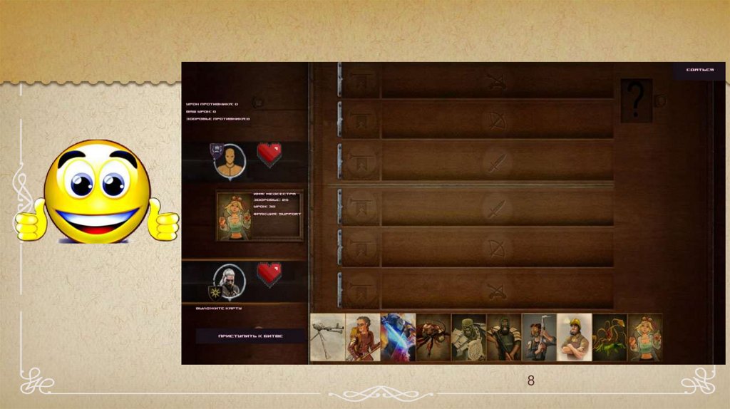 реализация функционала этих окон, разработка системы действий противника, системы карт,