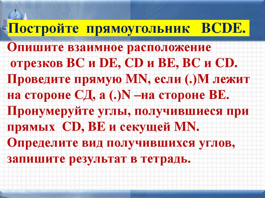 Постройте прямоугольник BCDE.Опишите взаимное расположение