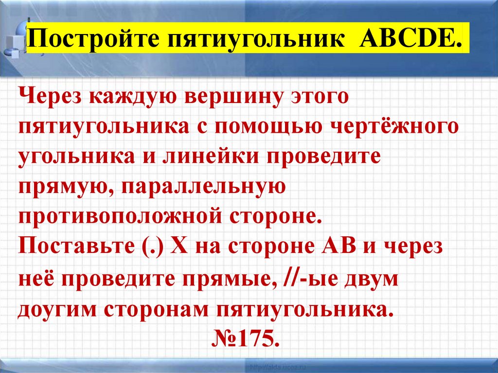 Постройте пятиугольник АBCDE.Через каждую вершину этого
