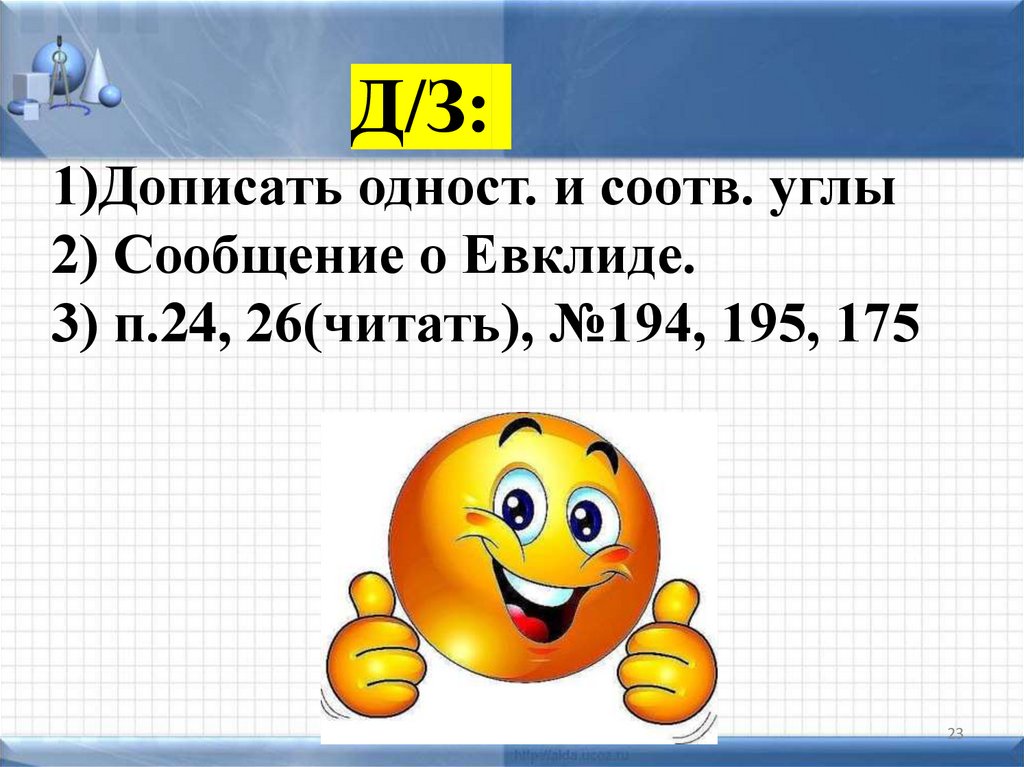 Д/З:1)Дописать одност. и соотв. углы