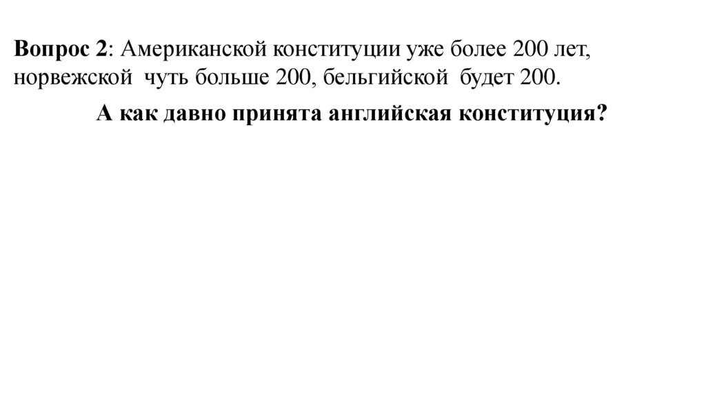 Вопрос 2: Американской конституции уже более 200 лет,норвежской чуть больше 200, бельгийской будет 200.