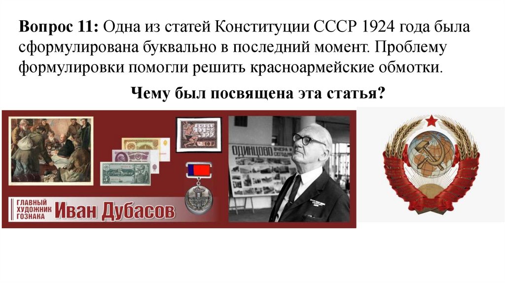 Вопрос 11: Одна из статей Конституции СССР 1924 года быласформулирована буквально в последний момент. Проблему