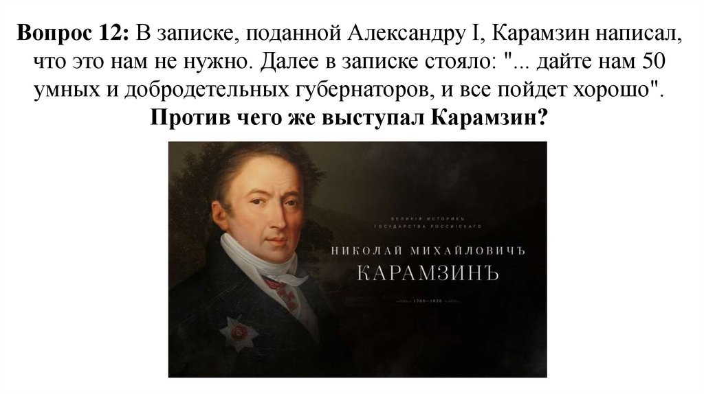 Вопрос 12: В записке, поданной Александру I, Карамзин написал,что это нам не нужно. Далее в записке стояло: "... дайте нам 50