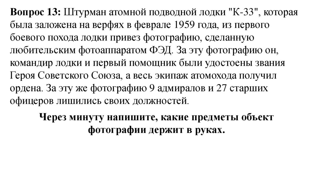 Вопрос 13: Штурман атомной подводной лодки "К-33", котораябыла заложена на верфях в феврале 1959 года, из первого