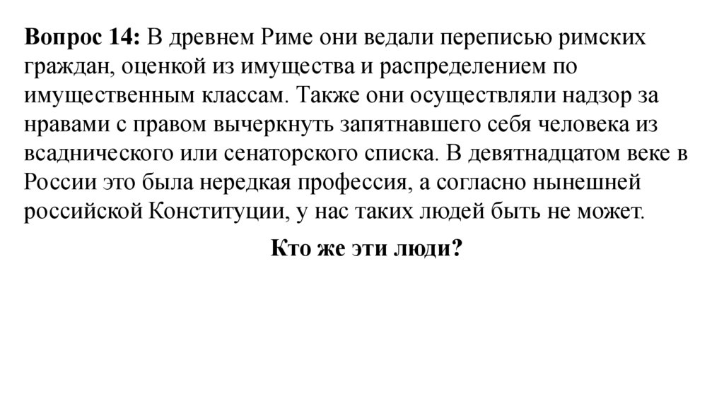 Вопрос 14: В древнем Риме они ведали переписью римскихграждан, оценкой из имущества и распределением по