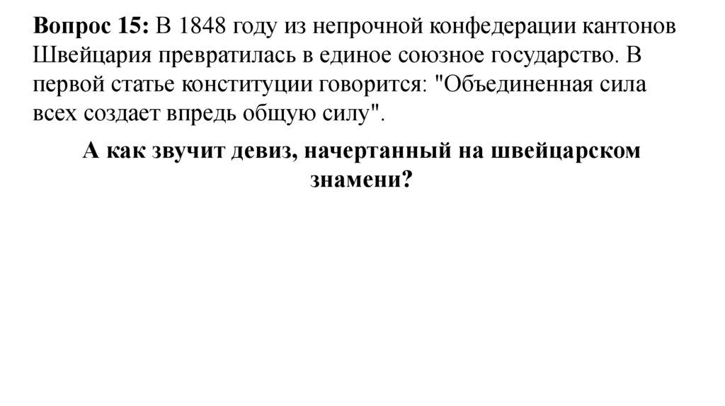 Вопрос 15: В 1848 году из непрочной конфедерации кантоновШвейцария превратилась в единое союзное государство. В