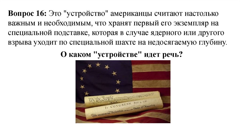 Вопрос 16: Это "устройство" американцы считают настольковажным и необходимым, что хранят первый его экземпляр на