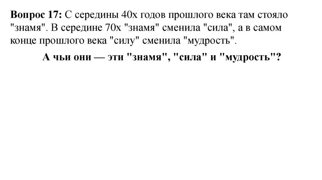 Вопрос 17: С середины 40х годов прошлого века там стояло"знамя". В середине 70х "знамя" сменила "сила", а в самом
