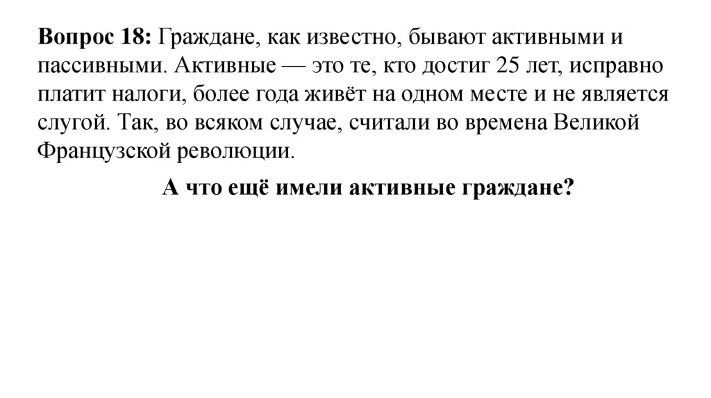 Вопрос 18: Граждане, как известно, бывают активными ипассивными. Активные — это те, кто достиг 25 лет, исправно