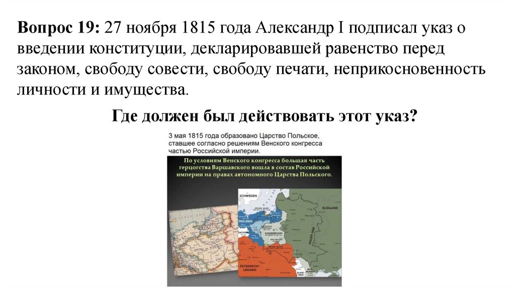 Вопрос 19: 27 ноября 1815 года Александр I подписал указ овведении конституции, декларировавшей равенство перед