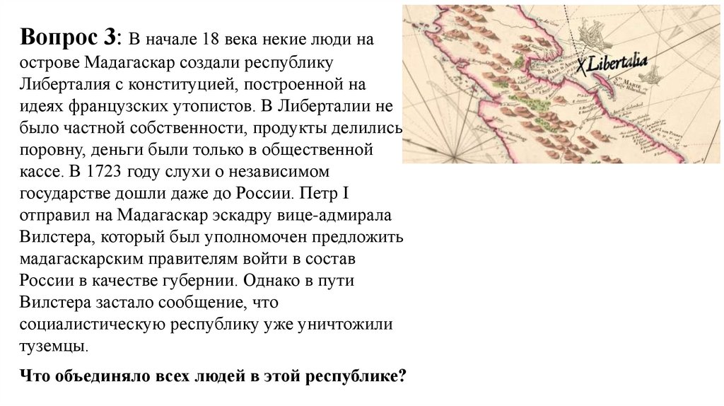 Вопрос 3: В начале 18 века некие люди наострове Мадагаскар создали республику