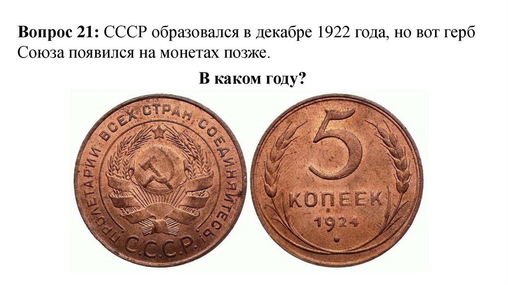Вопрос 21: СССР образовался в декабре 1922 года, но вот гербСоюза появился на монетах позже.