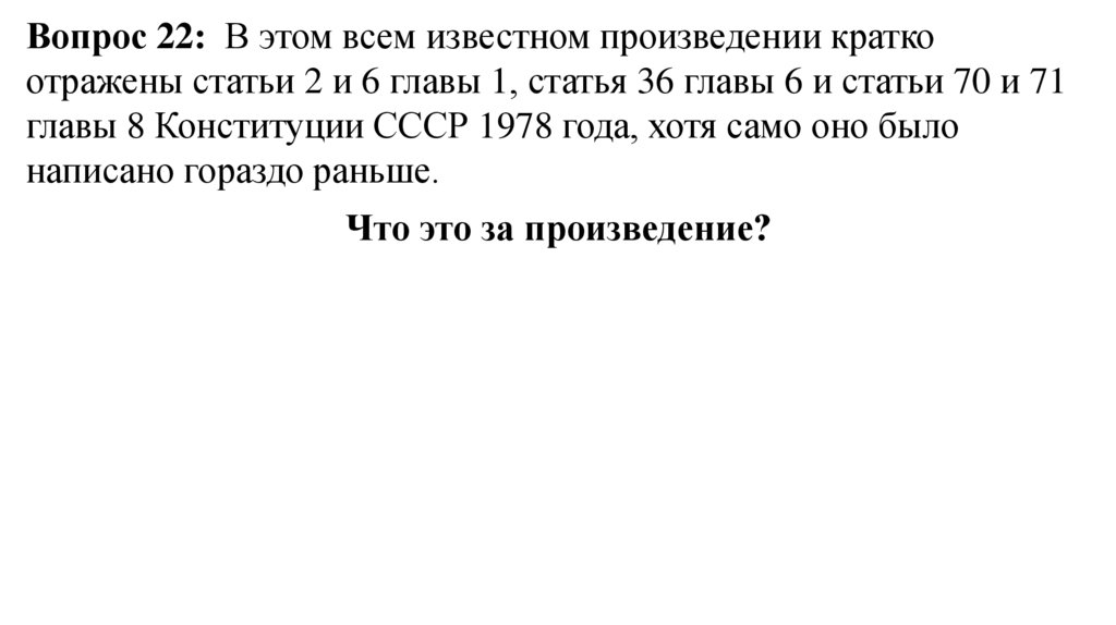 Вопрос 22: В этом всем известном произведении краткоотражены статьи 2 и 6 главы 1, статья 36 главы 6 и статьи 70 и 71