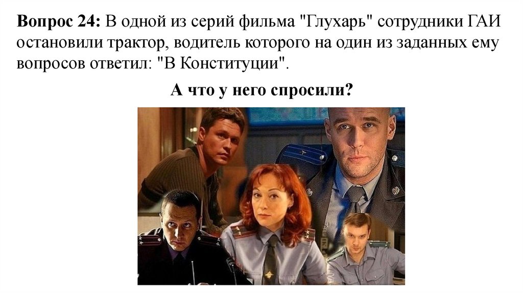 Вопрос 24: В одной из серий фильма "Глухарь" сотрудники ГАИостановили трактор, водитель которого на один из заданных ему