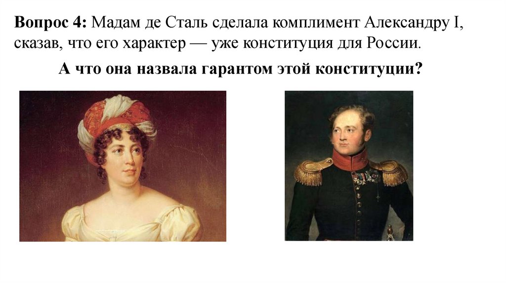 Вопрос 4: Мадам де Сталь сделала комплимент Александру I,сказав, что его характер — уже конституция для России.