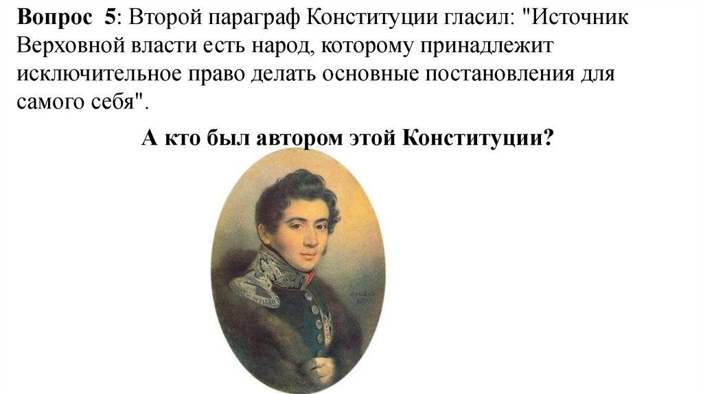 Вопрос 5: Второй параграф Конституции гласил: "ИсточникВерховной власти есть народ, которому принадлежит