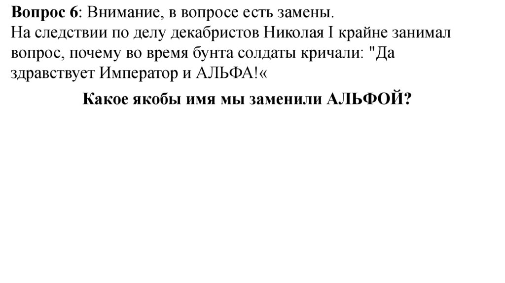 Вопрос 6: Внимание, в вопросе есть замены.На следствии по делу декабристов Николая I крайне занимал